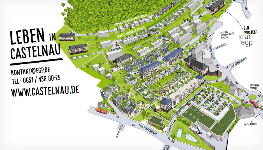 Das in Trier-Feyen entstehende Wohnquartier Castelnau erhält von uns eine prägnante Corporate Identity und einen Internetauftritt für die Vermarktung der vielfältigen Immobilienangebote des Quartiers. In der responsiven Website werden sämtliche Informationen zu Wohnformen und Immobilienangeboten gebündelt und für eine erfolgreiche Vermarktung aufbereitet.Zur Veranschaulichung des zukünftigen Quartiers hat propeller eine Illustration des gesamten Areals anhand von Fotos und architektonischen Plänen gezeichnet. Die Illustration zeigt ein lebendiges Quartier im fertigen Zustand und liefert dem Betrachter eine klare Vorstellung des zukünftigen Castelnau.
